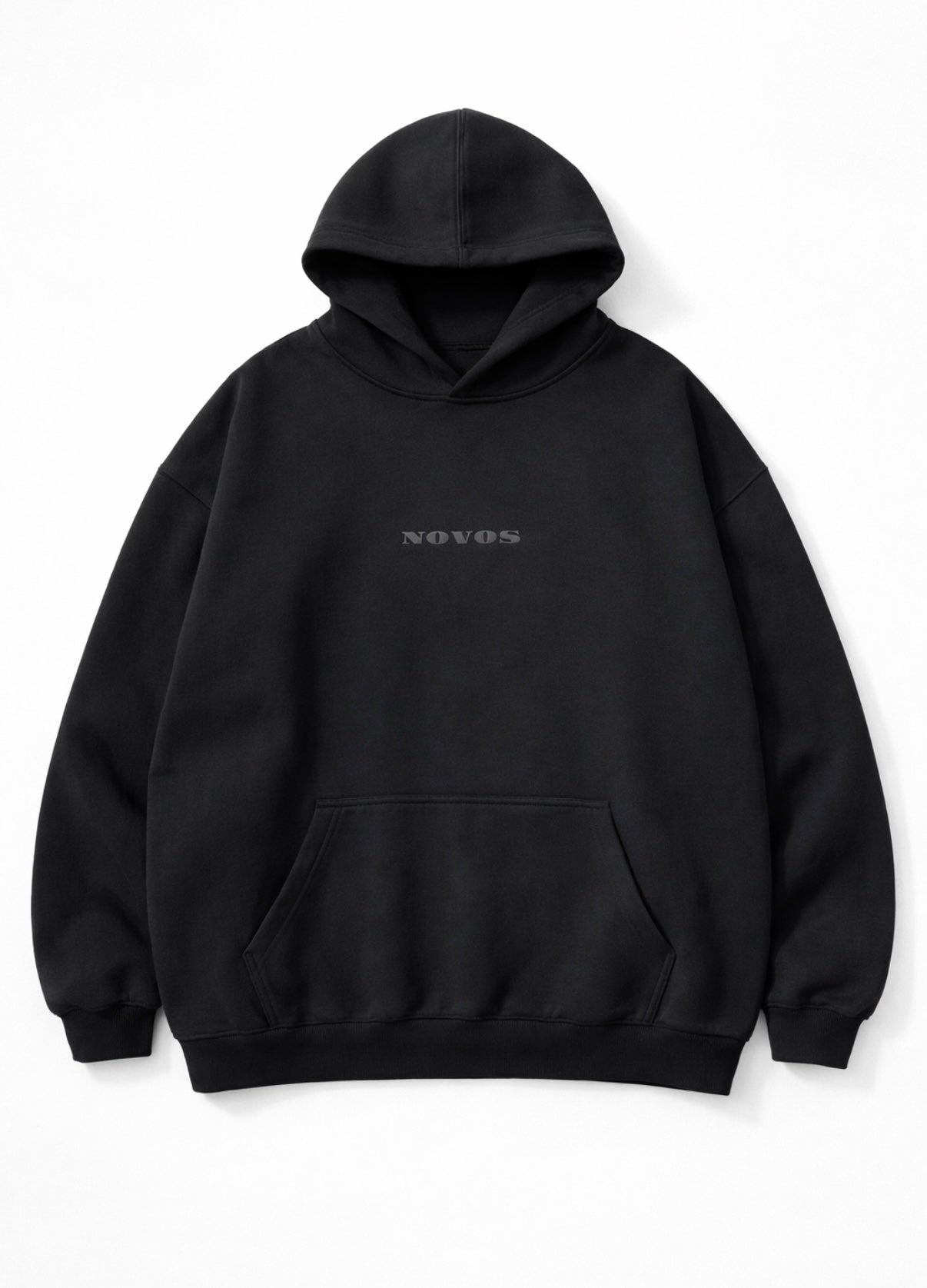 Oversized black streetwear hoodie with a minimalist design, crafted to combine comfort and style. Constructed from a thick, heavy fabric, it provides superior warmth and an elevated drape. Its 3D logo on the front adds a distinctive and contemporary element. Ideal for daily wear, cold days, and a bold street look.